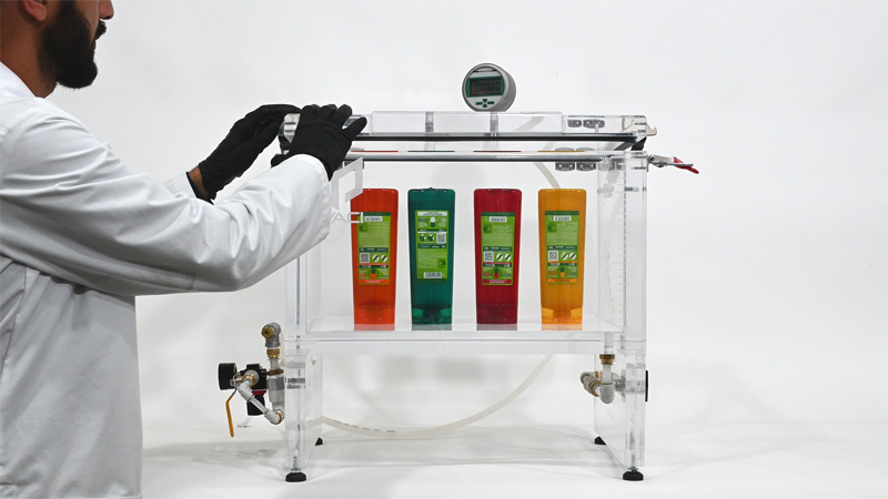 You can run dry tests or immersion tests, identifying leaks visually. It also allows you to simulate atmospheric pressure variations, replicating real transportation or storage conditions.