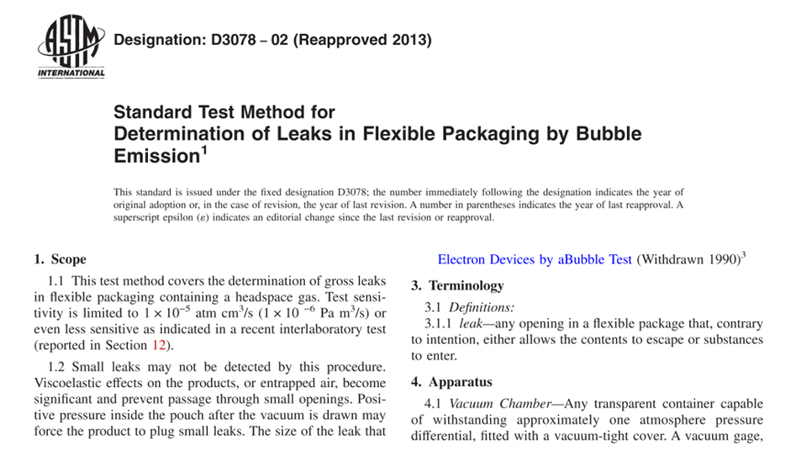 ASTM D3078 – Standard Test Method for Determination of Leaks in Flexible Packaging by Bubble Emission.